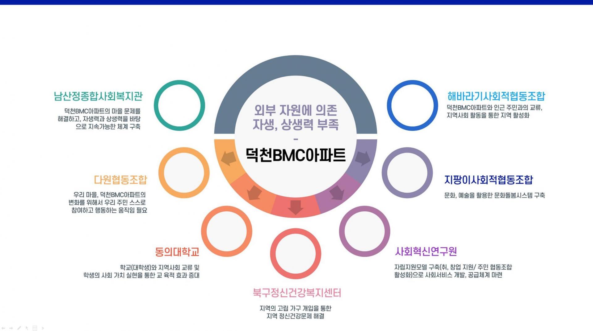 백본기관: 다원협동조합, 동의대학교, 북구정신건강복지센터, 사회혁신연구원, 지팡이사회적협동조합, 해바라기사회적협동조합